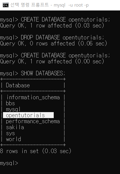 opentutorials가 생성된것을 확인할 수 있다! 이제, opentutorials 라는 database안에 작업을 할것인데 이때 MySQL에게